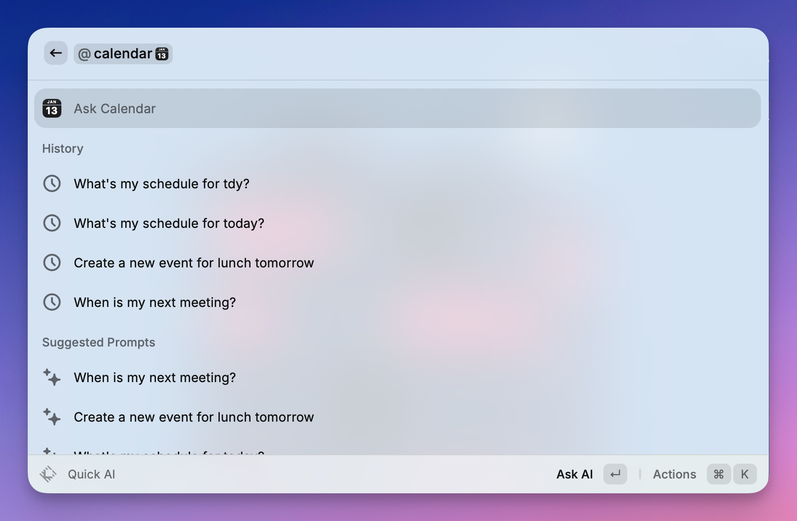 RaycastはネイティブのMac Spotlight検索(⌘ + スペース)を置き換えますが、AI統合がその強力さの源です。ネイティブアプリであるため、メールで選択した段落やVS Codeのコードなど、現在のコンテキストを「読み取る」ことができます。