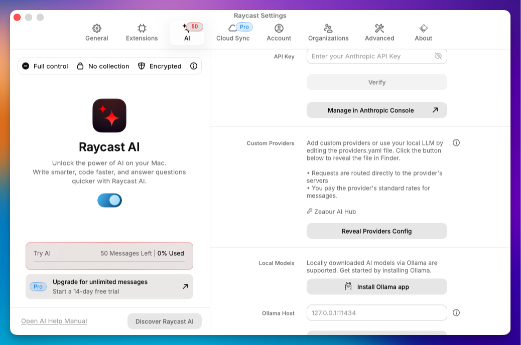 Raycast Proサブスクリプションは素晴らしいですが、多くのユーザーは独自のAPIキーを使用した「従量課金」アプローチを好むか、単に複数のAIモデル(Gemini、Claude、GPTなど)を1か所で管理する自由を望んでいます。