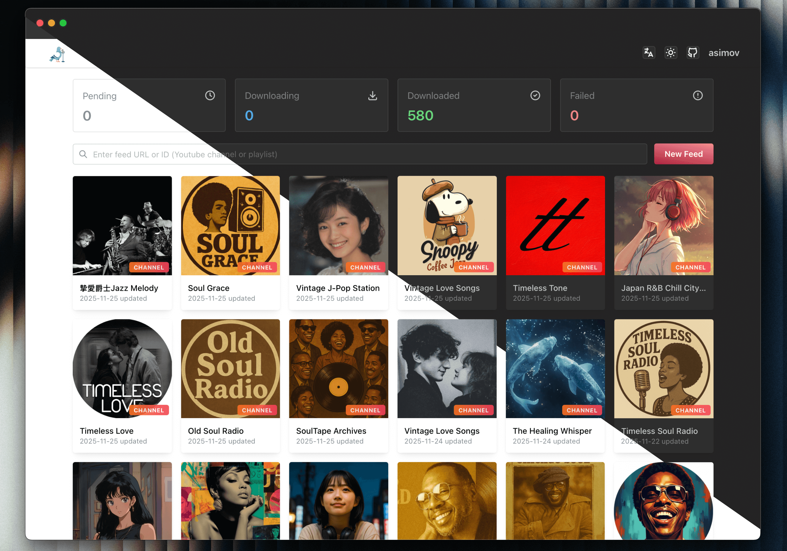 A self-hosted podcast gateway that converts YouTube and Bilibili channels into standard RSS feeds. Subscribe in any podcast app, with automatic sync, audio/video downloads, and a built-in web player.