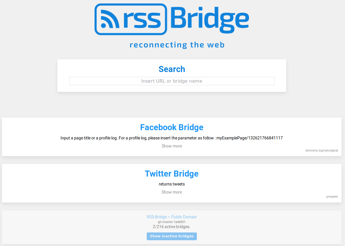 - Generate feeds — select a bridge, enter parameters (username, search query, etc.), and get an RSS or Atom feed URL