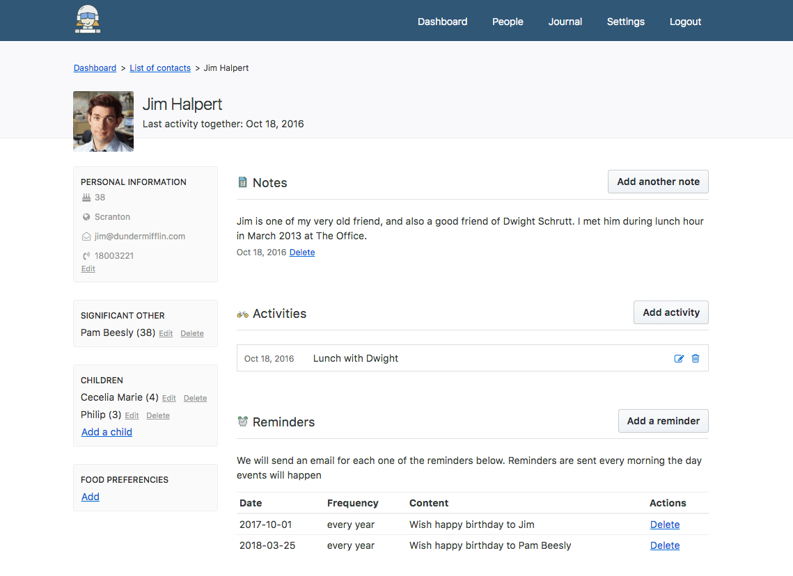 自托管的个人 CRM,整理与朋友、家人和商业联系人的互动。记录通话、追踪活动、设定提醒,集中管理所有人际关系。